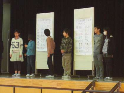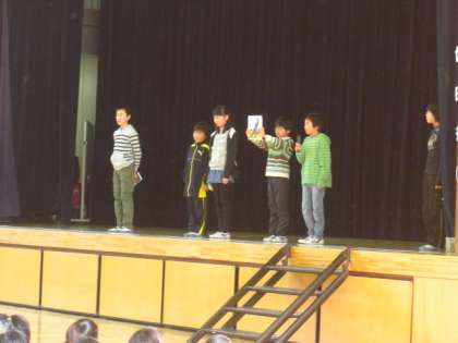 今日の児童集会は、図書委員会の発表でした。はじめに、低学年、高学年の好きな図書室本のジャンルのランキングの発表がありました。次に3冊の本の紹介がありました。そのあと、図書室の使い方の寸劇、委員会の話し合いの様子の劇そしてクイズがありました。図書室の利用の仕方や、図書委員会の内容についてよくわかるようになりました。