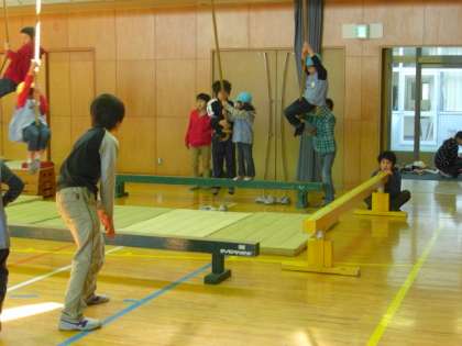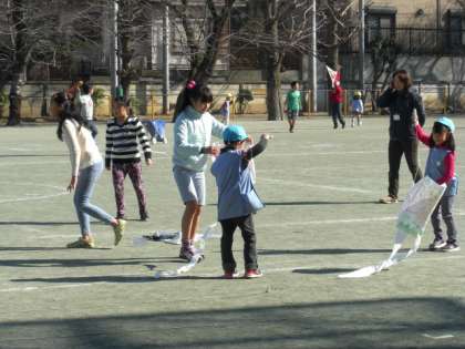 遊びの時間に5年生は7つの遊びを用意しました。八幡山幼稚園の子どもたちは、遊びたい場所によって遊びました。5年生はやさしく遊びを手伝ったり、教えたりしました。