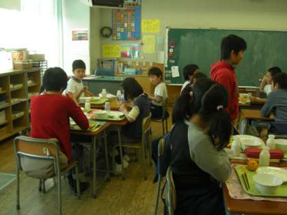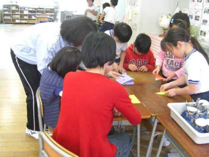 久我山青光学園の本間はるなさんが、副籍交流で3年3組に来ました。3年生になって2回目です。今日は、給食、休み時間、掃除を3年3組の子ども達といっしょにすごしました。休み時間には、いっしょに折り紙を折りました。