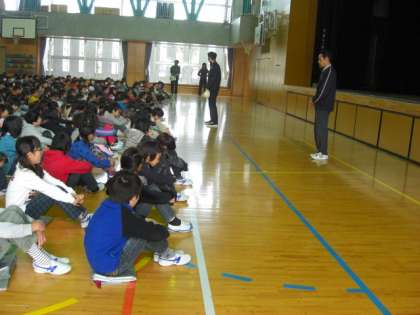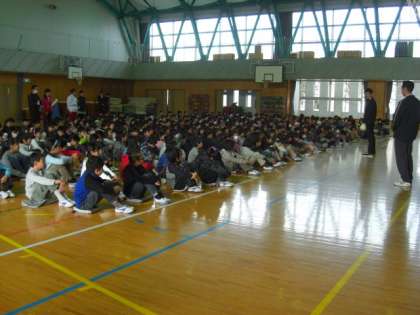 避難訓練を行いました。休み時間に地震が起きたという想定で行いました。校庭には、雪が積もっていて出られないので、体育館に集まりました。校長先生から、とても上手に集合できていたとほめていただきました。また、地震の時には、落ちてこない、倒れてこない場所に逃げることが大切だというお話がありました。