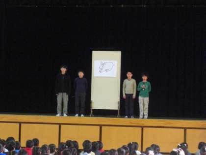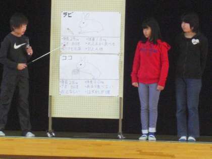 今日は、飼育委員会の発表集会でした。八幡山小学校には、ウサギが3匹います。今日は、飼育委員の子どもたちが、ウサギについて詳しく発表してくれました。はじめにうさぎについて食べ物や、種類などの発表がありました。次に、ウサギの抱き方について、実際にウサギを抱く様子を見せながら発表がありました。次に、学校にいるウサギの名前や特徴の発表がありました。そして三択クイズをして終わりでしたが、盛りだくさんの内容での発表でした。