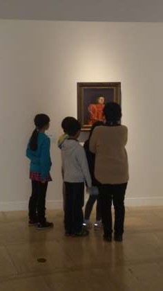 岸田劉生の麗子像を前に、係の人から説明を受ける子どもたち。熱心に見学しています。