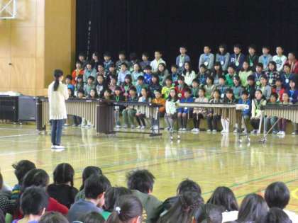 そして5年生の作ったメダルを6年生にプレゼント。最後に、6年生から合奏のプレセントがありました。明るく楽しい音楽を聞かせてもらいました。いろいろなところでふれあってきた6年生ともあと少しでお別れです。最後に列になって6年生を見送りました。