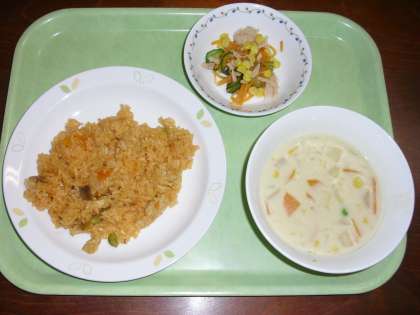 「チキンライス、にんじんサラダ、クリームスープ、牛乳」です。