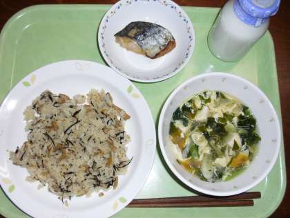 「ひじきごはん、鰆の照り焼き、かきたま汁、牛乳」です。