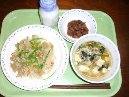 「たけのこごはん、豆腐汁、煮豆、牛乳」です。