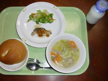 「ミルクパン、魚のバーベキューソース、フレンチサラダ、ポトフ、牛乳」です。