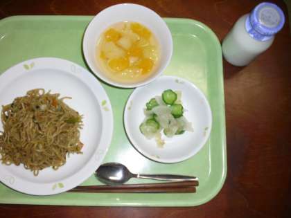 「ソース焼きそば、きゅうりと大根のごま風味、フルーツ白玉、牛乳」です。