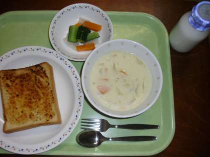 「ガーリックトースト、クラムチャウダー、ピクルス、牛乳」です。