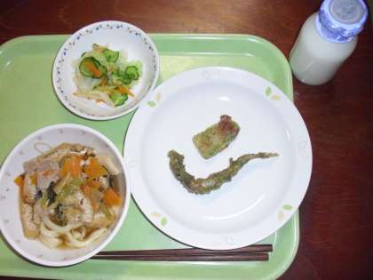 「煮込みうどん、ししゃもの磯辺揚げ、ちくわの磯辺揚げ、野菜の甘酢かけ、牛乳」です。