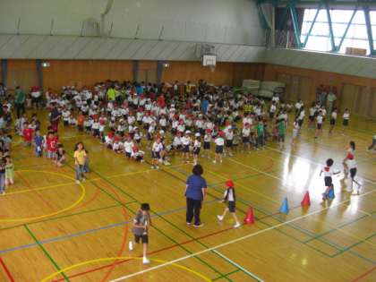 今日は、集会委員会が企画した「ピンポン玉運び集会」でした。各学年の折り返し地点を変えて学級対抗で行いました。3位は2年2組、2位は2年1組、1位は4年3組でした。玉じゃくしからピンポン玉が落ちそうになるので、気をつけて運びました。1年生も6年生もいっしょに楽しめた集会でした。