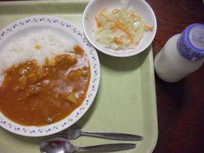「ハッシュドポークライス、キャベツサラダ、牛乳」です。