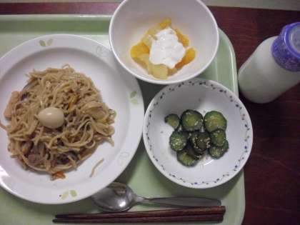 「五目焼きそば、きゅうりの中華味、フルーツヨーグルト、牛乳」です。
