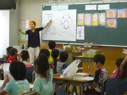 1年生は、養護教諭の三好先生にお手伝いをしてもらって、歯磨き指導をしました。歯について教えていただいたり、歯ブラシでの上手な磨き方を教えていただいたりしました。丈夫な歯を一生使えるようにしたいものです。