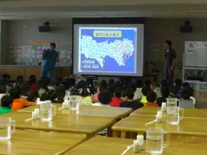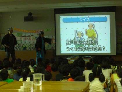 1,2校時に、4年生は、東京都水道局の水道キャラバンの方から水道について教えてもらいました。実験をしたり、DVDを見せていただいたりしました。水道がいつごろどのようにしてできたのか、どのようにして私たちの家庭まで水が届くのかなどたくさんのことを学びました。