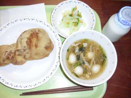 「揚げパン、春雨スープ、中華サラダ、牛乳」です。