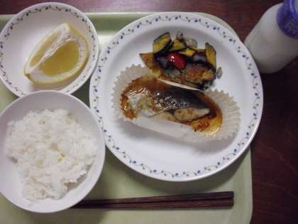 「ごはん、鰆の梅肉焼き、夏野菜の南蛮かけ、美生柑、牛乳」です。