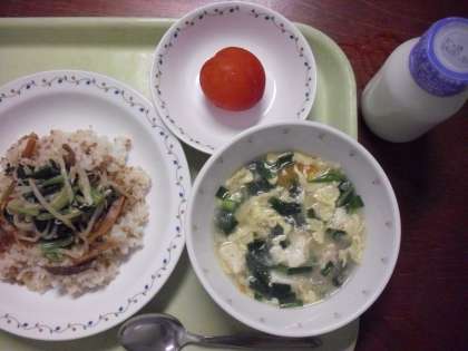 「ビビンバ、にらたまスープ、プラム、牛乳」です。