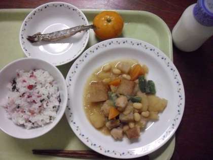 「梅わかごはん、豆入り筑前煮、焼きししゃも、冷凍みかん、牛乳」です。
