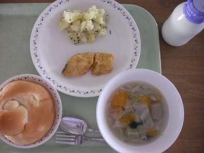 昨日までの台風が、高い青空を運んできてくれたようです。今日は淡白な「メルルーサ」に食欲を促進する「カレー粉」をまぶして揚げました。熱中症予防のためにも、牛乳も残さず飲んでほしいと思います。