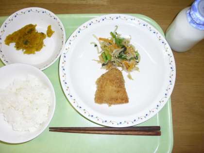 「ごはん、いかフライ、野菜のおかかかけ、南瓜の含め煮、牛乳」です。