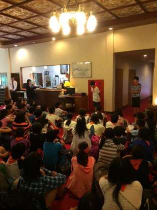 予定より少し早く梅屋敷旅館に到着しました。明るいおかみさんに出迎えられ、ロビーで開園式です。