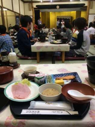 朝会から直行で朝食です。しっかり食べて、ハイキングに備えます。