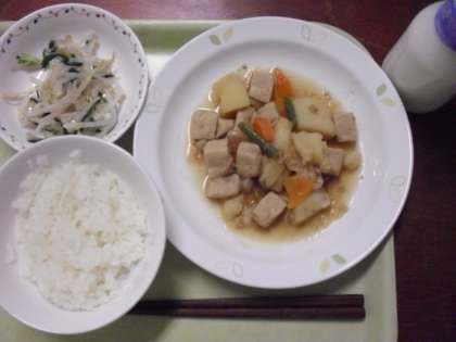 「ごはん、じゃが芋のそぼろ煮、もやしのごま風味、牛乳」です。