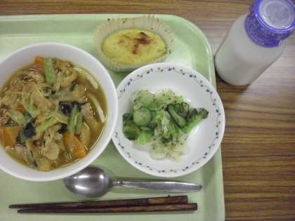 「カレーうどん、スイートポテト、野菜のゆかりかけ、牛乳」です。