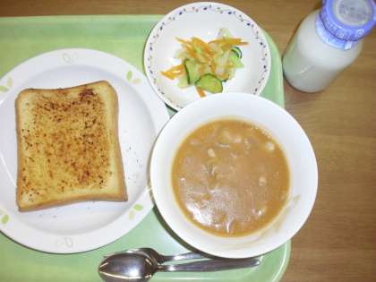 「ガーリックトースト、ビーンズシチュー、イタリアンサラダ、牛乳」です。
