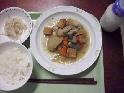 「ごはん、豆入り筑前煮、もやしのカレー風味、牛乳」です。