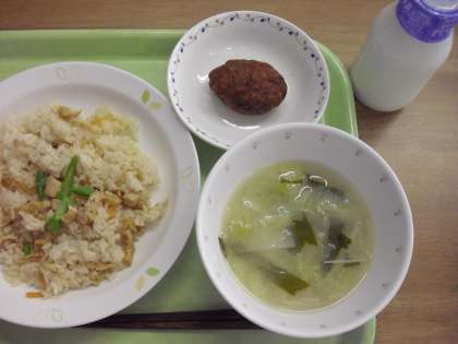 「こぎつねごはん、豆腐のナゲット、味噌汁、牛乳」です。