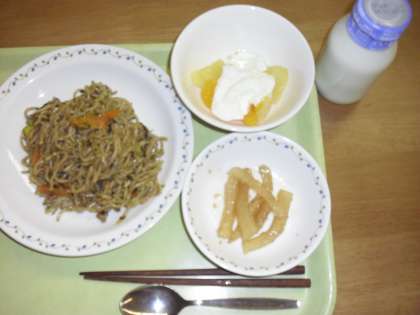 「ソース焼きそば、大根の中華味、フルーツヨーグルト、牛乳」です。