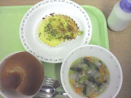 「黒砂糖パン、フレンチエッグ、白菜スープ、牛乳」です。