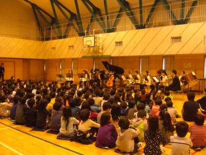 本校卒業生の宮里さんと波多野さんと11人の音楽家が八幡山小学校に今年も来てくださいました。第2体育館は、コンサート会場となり、手の届きそうなところで、ミニオーケストラの演奏を聴きました。今年の演目は、ムソルグスキーの「展覧会の絵」でした。9枚の絵を音楽にしたことを教えていただきました。また、それぞれの楽器の音色を聞かせてもらいました。