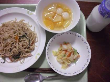 「塩焼きそば、辣白菜、フルーツ白玉、牛乳」です。