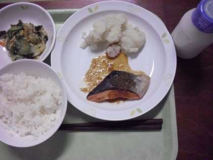 「ごはん、鮭のステーキソース、粉ふき芋、和風サラダ、牛乳」です。
