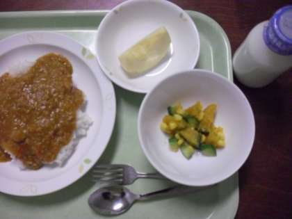 「キーマカレーライス、パンプキンサラダ、りんご、牛乳」です。