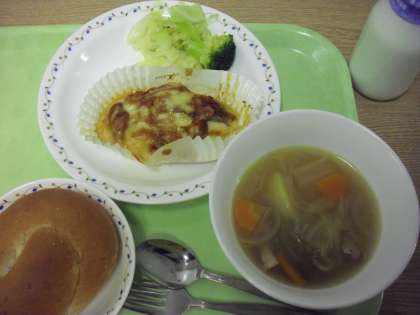 「セサミパン、白身魚のピザ風焼き、ブロッコリーサラダ、田舎風スープ、牛乳」です。
