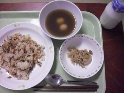 「豚肉とごぼうのごはんん、きのこ入り煮浸し、白玉しるこ、牛乳」です。