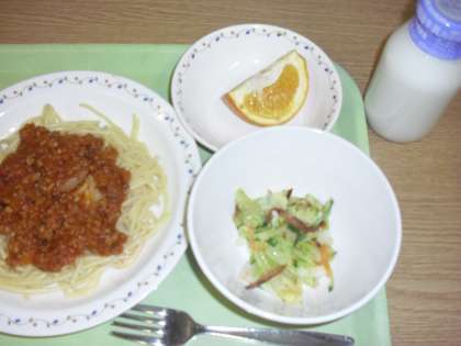「スパゲティミートソース、ごぼうチップサラダ、いよかん、牛乳」です。