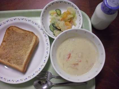 「セサミトースト、クリームスープ、フレンチサラダ、牛乳」です。
