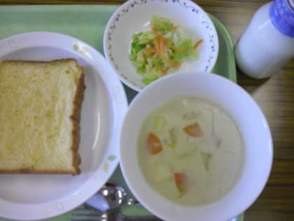 「フレンチトースト、クリームシチュー、キャベツサラダ、牛乳」です。