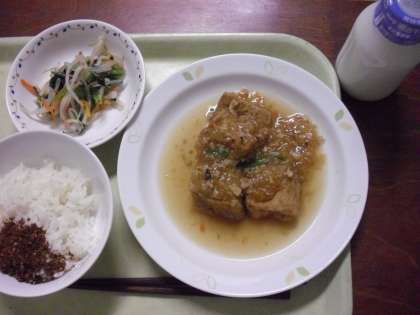 「ごはん、かつおでんぶ、生揚げのそぼろあんかけ、おひたし、牛乳」です。