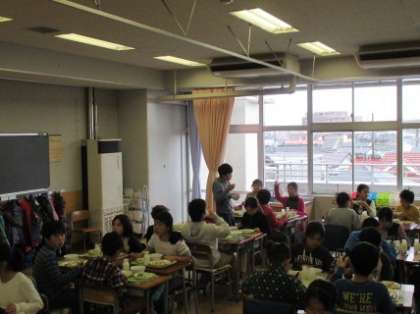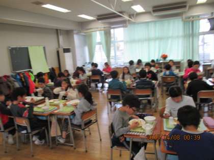 今日から給食が始まりました。給食当番は張り切って準備をしていました。そして、みんなで手を合わせ、感謝の気持ちをこめて、「いただきます!」。おかわりもして、どのクラスもおいしく、しっかりいただきました。(副校長)