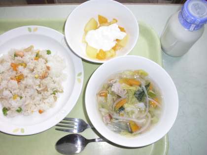 「鮭ピラフ、ベーコンと野菜のスープ、フルーツヨーグルト、牛乳」です。