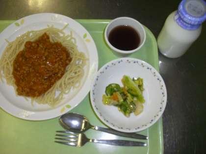 「スパゲティミートソース、イタリアンサラダ、ぶどうゼリー、牛乳」です。