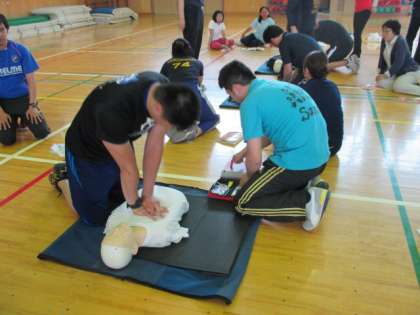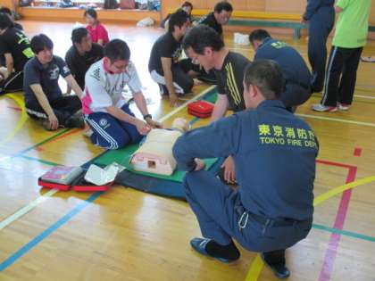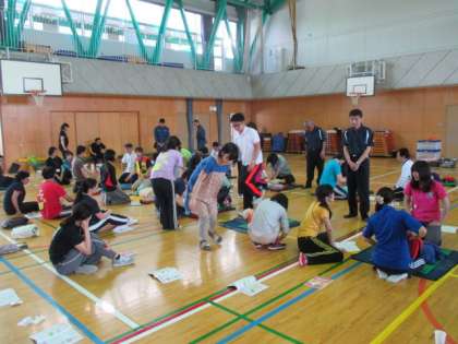 同じみどりの学び舎である、上北沢小学校、経堂小学校の3つの小学校合同で、救急救命法の研修が、消防署の方々の指導のもと、本校体育館で行われました。心肺蘇生法は、6月からの水泳指導を前に、どの小学校でも全教職員が事前に受けておく必要のある研修です。初夏を感じさせるような気温が上昇する体育館で、各学校の先生たちは真剣に訓練を受けていました。