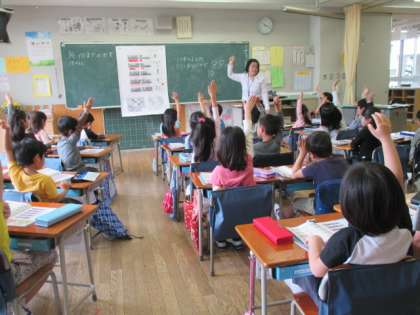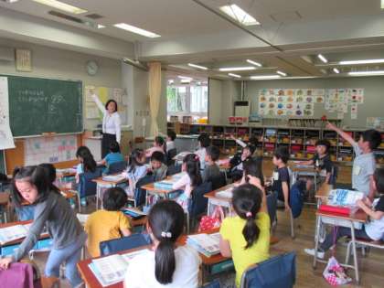 連休明け、1年生もがんばっています。1年2組では、算数で「10までのかず」の学習に取り組んでいました。ブロックを使って、1から順番に数を唱え、10までの数の呼称と大きさを学びました。全員、元気に手を挙げていて、とても活気のある授業でした。