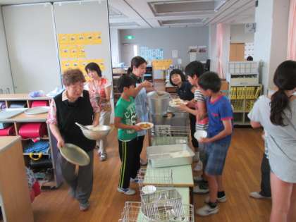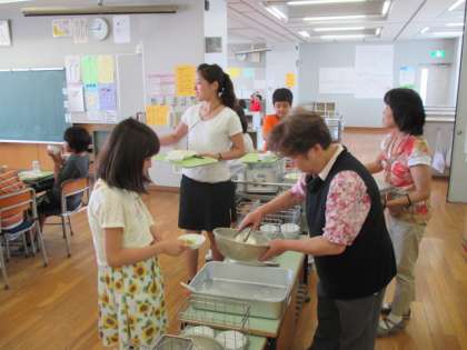八幡山小学校では、給食の時間の後半になると「給食のおかわり隊」が登場します。高学年を中心に、職員室の食缶をもって栄養士の先生や事務主事さん方が、既にきれいになっている各教室の食缶に追加したり、おかわりしたい児童には直接配膳したりしてくれます。今日も高学年の子どもたちは、どのクラスもモリモリ食べていました。